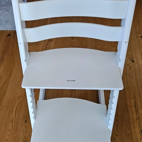 Stokke Tripp Trapp barnestol i hvitmalt tre. I god stand, men noe bruksslitasje på overflater, se bilder for detaljer.