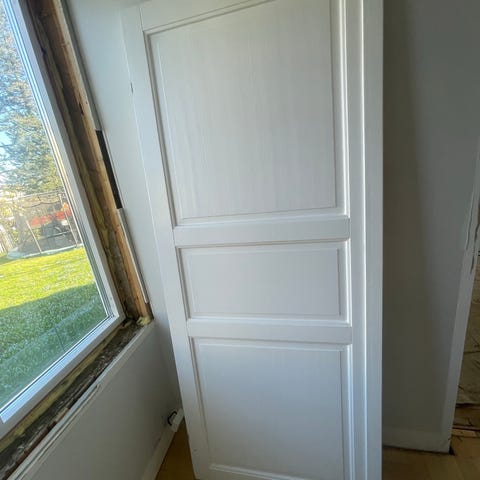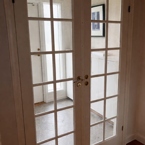 Innvendig dobbel glassdør i hvit utførelse. Døren består av to fløyer med sprosseinndelte glassfelt som slipper lys mellom rom. Leveres med dørhåndtak og låskasse montert på den ene døren. Egnet som romdeler mellom for eksempel stue, kjøkken eller gang der man ønsker visuell kontakt og lysgjennomgang samtidig som rommene kan lukkes av.