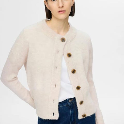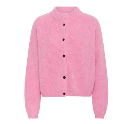 Gestuz AlphaGZ Short Cardigan i størrelse XS. Cardiganen er rosa og har knappelukking foran. Strikket struktur og mykt materiale i alpakkull gir et lunt plagg.