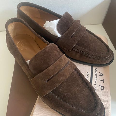 Airola Suede fra ATP Atelier. Airola er en chic loafer fra ATP Atelier perfekt til hverdags. Airola Suede har et klassisk og tidløst design i brunt semsket skinn, med spiss tå og en liten hæl. Skoene har et feminint preg og smal passform som gjør de enkle å style. Airola Suede er håndlagetlaget i Italia av nappa som gjør de svært komfortable. Hælhøyde: 2 cm. Hvis du er mellom to størrelser anbefaler ATP Atelier å gå ned en størrelse.