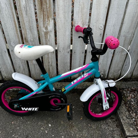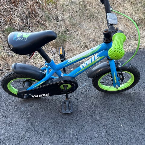 White barnesykkel med 12" hjul i blå og grønn farge. Sykkelen har rett styre med grønne holker, sadel med White-logo og kjedekasse som dekker kjedet. Passer for mindre barn som trenger en liten sykkel med 12-tommers hjul til bruk på asfalt og jevnt underlag.