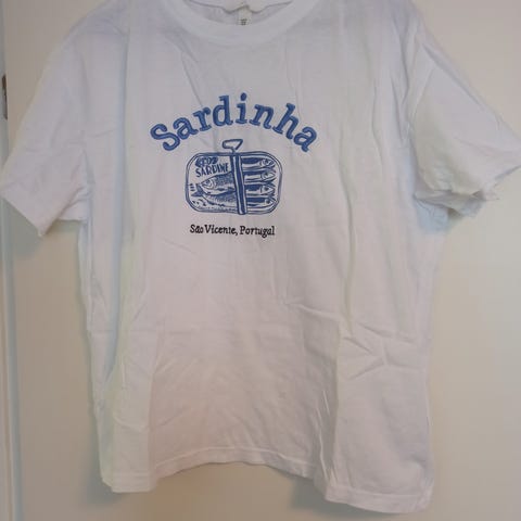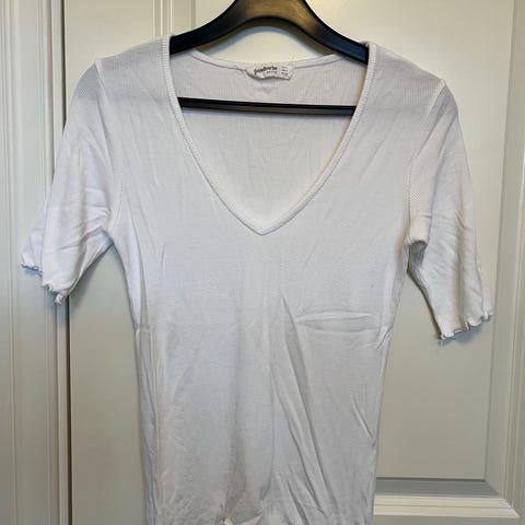 Stradivarius T-skjorte i størrelse M for dame. T-skjorten er hvit og laget av bomull. Den har kort erm og rund hals. Vintage lignende print. Ingen merker.