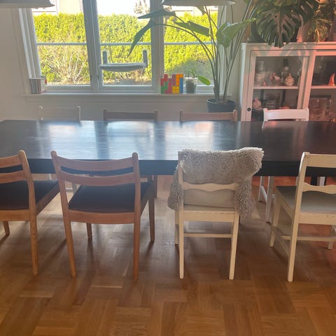 Spisebordet har 4 stoler i sort skai, Jeg bruker bare tre hvis det ikke skulle være behov av en til. Det ser ikke brukt ut Ingen slitasje eller merker. Førstemann til mølla får det billig. Selges pga flytting til Thailand.