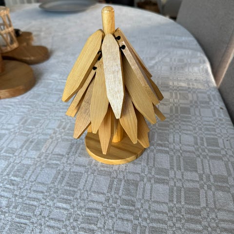 Unikt og dekorativt sett med bordskånere i tre, formet som et lite tre 🌲 Når de ikke er i bruk, står de samlet som en stilren dekorasjon på bordet.