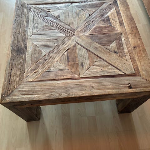 Rustikk salongbord fra Home & cottage selges. Bordet er solid og stort 120x120cm, og ca 40 cm høyt. Låvepreg. Bordet kan ikke legges sammen. Må hentes.