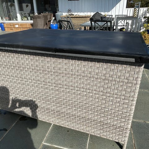 Blomsterkasse i tre, rektangulær form, egnet for utendørs bruk. Kassen har åpne lameller på sidene og er fylt med jord, klar for ny beplantning. Passer til plassering langs husvegg, i hage eller på terrasse for planting av blomster, urter eller mindre planter. MÅ HENTES
