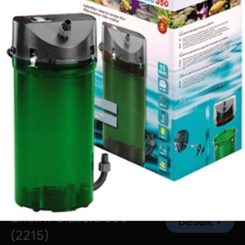Eheim eXperience 350 utvendig filter til akvarium. Filteret er beregnet for akvarier og leveres som komplett ekstern filterenhet. Modellen har flere filterkurver for mekanisk og biologisk filtrering, og er egnet for både ferskvannsakvarier og saltvannsakvarier etter behov. Enheten plasseres utenfor akvariet og kobles til med slanger for inn- og utløp av vann. Effekt og anbefalt akvariestørrelse følger spesifikasjonene fra produsenten for eXperience 350-serien.