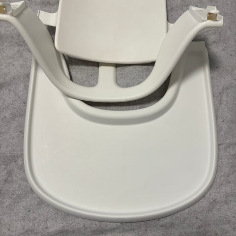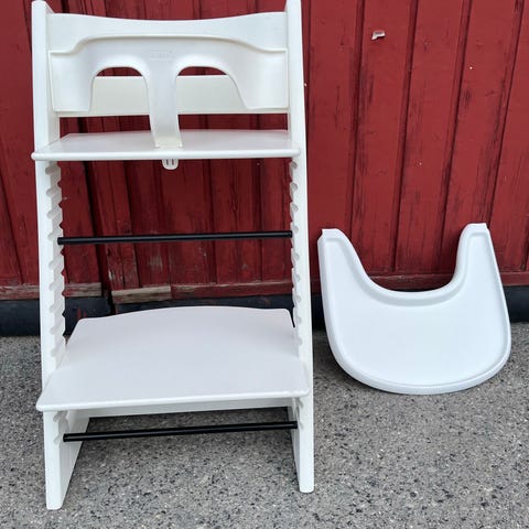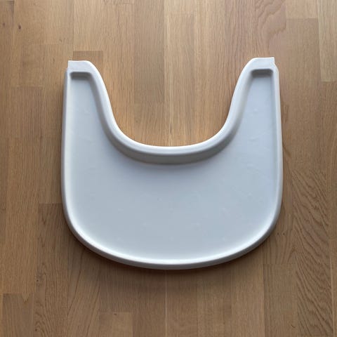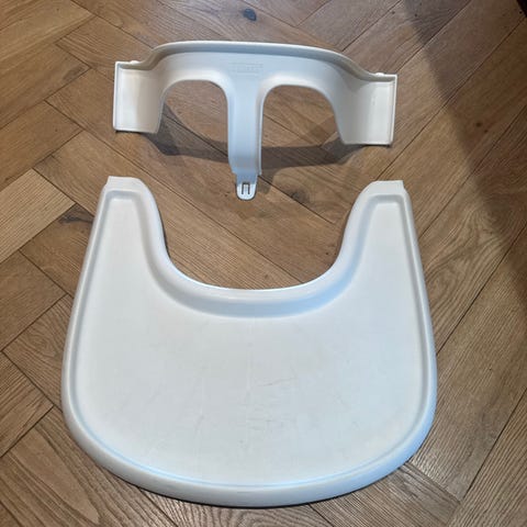 Stokke høy barnestol tilbehørssett i hvit plast. Settet består av