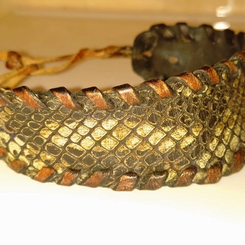 Unikt armbånd i ekte vintage-stil fra sent 1980-tall. Røft og dekorativt design med svart skinnrem og en iøynefallende gullfarget midtdetalj formet som blad/stjerne. Kombinert med ringer i metall og varme bruntoner som gir et kult, bohemsk uttrykk.