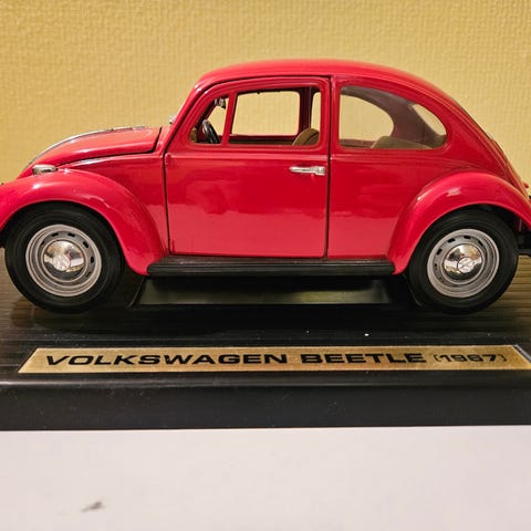 Volkswagen 1965 VW Beetle modellbil i mørk blå farge. Modellen viser en klassisk Boble med detaljer som kromfargede støtfangere, felger og interiør. Bilen står på en sort sokkel merket «1965 VW Beetle» og leveres i en rød eske. Egner seg som samlerobjekt eller utstillingsmodell.