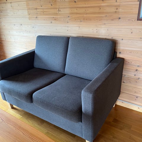 Blå toseters sofa med avrundede armlener og rygg. Sofaen har tekstiltrekk og rette treben. Kompakt størrelse som passer godt i mindre stue, gjesterom eller som ekstra sitteplass. Nøytral blåfarge som er enkel å kombinere med annet interiør.