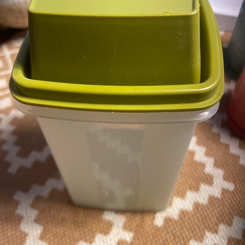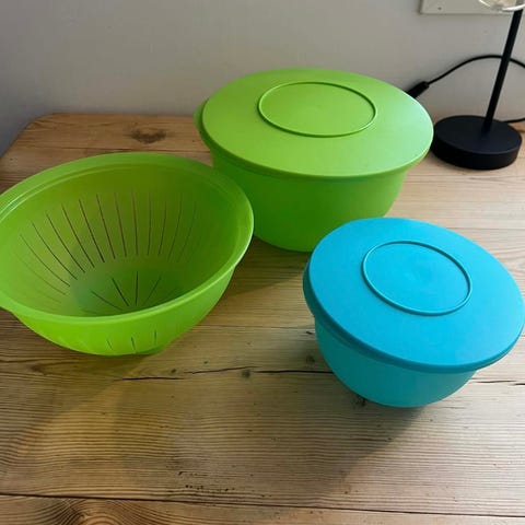 Tupperware boller med lokk i grønn plast. Sett med fire boller i ulike størrelser, alle med tilhørende lokk. Bollenes utforming gjør dem egnet til oppbevaring av mat i kjøleskap eller på kjøkkenbenk, samt til servering og tilberedning. Laget i plast som er lett å rengjøre og stable for plassbesparende oppbevaring.