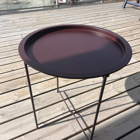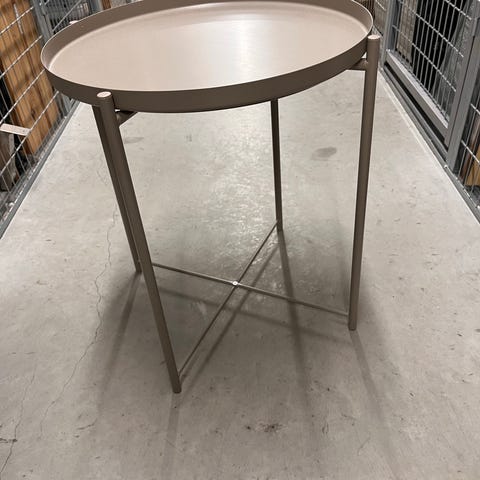 Lite rundt metall sidebord med avtakbart brett.