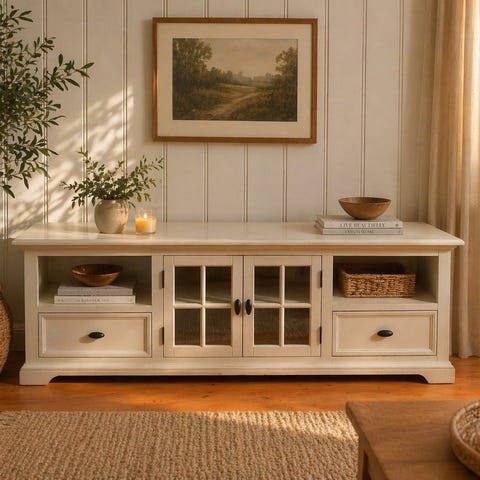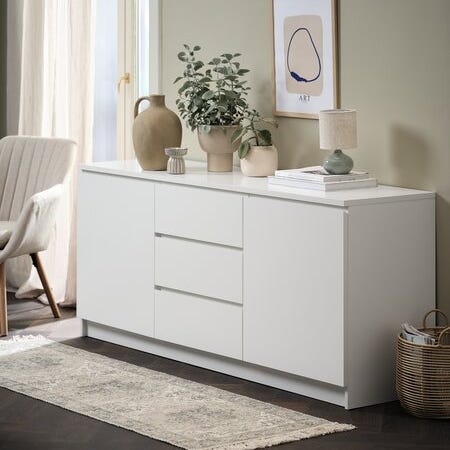 Skjenken har en praktisk og gjennomtenkt løsning med tre romslige skuffer i midten og to skap med glassdører på sidene. De dekorative kryssdetaljene gir et elegant uttrykk, samtidig som du kan vise frem det du ønsker.