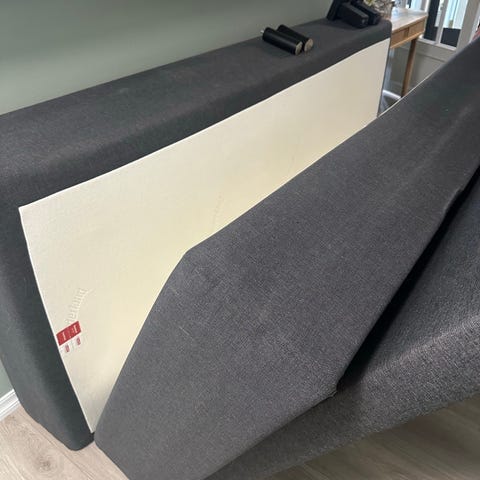 Seng med madrass, over madrass, sengegavel, nattbord og kommode