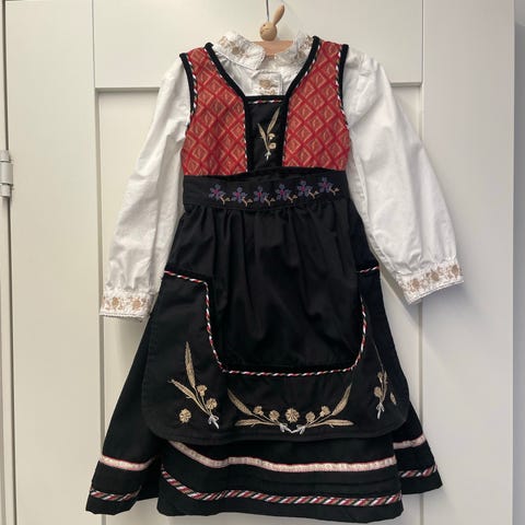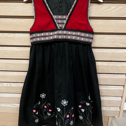 Nydelig festdrakt for barn i størrelse 92. Liv i lyst brokadelignende stoff. Noen få løse tråder her, men ikke iøyenfallende. Sort skjørt og forklede med broderier og bånd nederst på skjørtet.