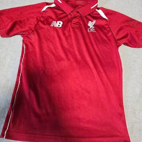 New Balance Liverpool FC fotballdrakt i rød farge. Størrelse 134 (EURO). Drakten har krage med hvite detaljer og trykk av klubbemblem og sponsorlogoer på bryst og erme. Materialet er syntetisk stoff egnet for fotball og annen fysisk aktivitet. Passer til barn rundt størrelse 134.