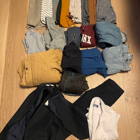 Noen plagg har noen små flekker, de er ikke forsøkt fjernet. Ellers er plaggene hele og uten hull.