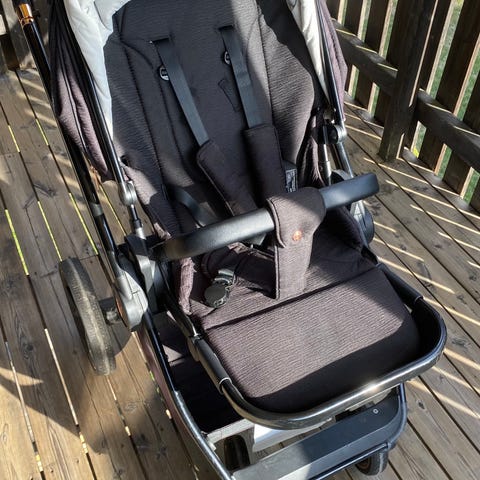 Den er nå montert med sportsdel. Alle deler tilhørende vognen følger med, i tillegg til noe ekstrautstyr: myggnett, regntrekk og UV paraply.