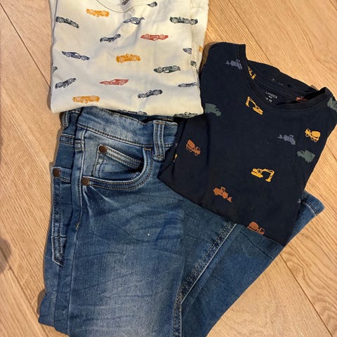 Nye gensere fra Lindex til gutt i størrelse 98/104 Pakke med flere ulike gensere i bomull, med forskjellige flerfargede mønstre og motiver. Alle plaggene har lange ermer og rund hals. Egnet til hverdagsbruk for barn i tilsvarende størrelse.