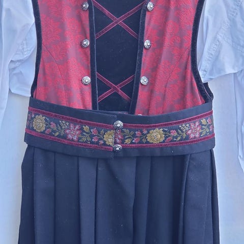 Bunadkjole i størrelse XS (122) for 6-7 år. Kjolen er flerfarget med hovedfarge i mørk tone og kontrastfelt i rødt. Materiale i hovedsak polyester, med detaljer som gir et tradisjonspreget uttrykk. Plagget passer til kvinne og kan brukes ved høytider og andre anledninger der en pen kjole er ønsket. Ytterstoffet består av polyester og viskose, med fôr i polyester, ifølge vaskelappen.