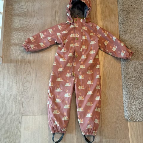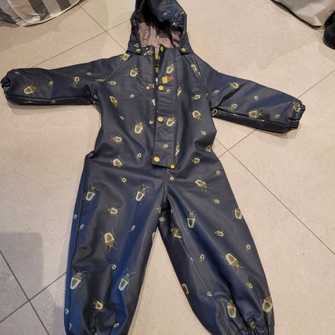 Kattnakken vinterregndress i størrelse 92. Dressen er i blå polyester med mønster og har hette. Det er bittelite hull på kneet og litt bruksmerker bak, se bilder. Ellers er den hel og fin og klar til bruk.