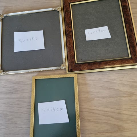Veldig fin ramme i almrot/trefarget folie, med vintage look. Ytre mål: Ca. 23 × 33 cm. Kan både henges opp og stå. Noen små bruksmerker, men ikke noe som vises godt. Fremstår pent brukt og i god stand.