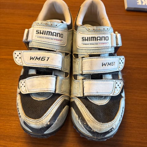 Shimano ME4 sykkelsko SPD i størrelse 39. Skoene er svarte med blå detaljer og har borrelåsstropper kombinert med BOA-stramming på vristen for justerbar passform. Sålen er tilpasset SPD-klosser og har grovt mønster for godt grep ved gåing. Egnet som terreng- eller stisykkelsko med klikkpedalsystem. Pedaler med SPD-feste følger med, som vist på bildene.
