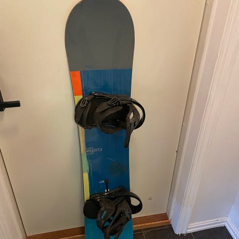 Burton snowboard med bindinger i svart plast. Brettet har gul og beige bunnfarge med grafisk motiv og klistremerker. Snowboardet leveres med monterte Burton-bindinger som har justerbare stropper. Passer til bruk i alpinbakke og park, og er egnet for kjørere som ønsker et komplett oppsett med brett og bindinger.