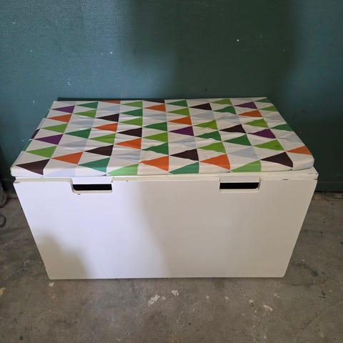 IKEA stuva benk med oppbevaring på hjul. Praktisk oppbevaringsløsning til barnerom for leker, puter eller annet utstyr. Åpninger i front gjør det enklere å åpne og lukke lokket.