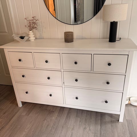 En vell brukt kommode men med masse bruk igjen. Noen bruksmerker som lett skjules med en duk eller plante 😅 litt gulna hvitfarge på skuffe på venstre delen av kommoden.