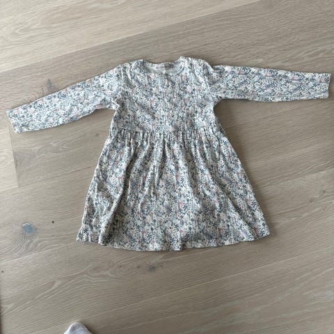 🌸Nydelig Newbie kjole i størrelse 110. Kan fint brukes fra str. 104. Kjolen er i beige bomull med blomster- og kaninmønster. Langermet modell med litt "puff" på skuldrene, strikk i midjen og rund hals. Materiale: 100 % bomull.