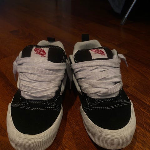 Vans skinn sneakers i størrelse 40.5. Skoene har overdel i lys/hvit tone med svart stripe og svarte lisser. Klassisk lav modell med vulkanisert såle og karakteristisk Vans-yttersåle i gummi. Egnet som fritidssko til hverdagsbruk.