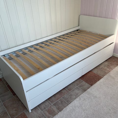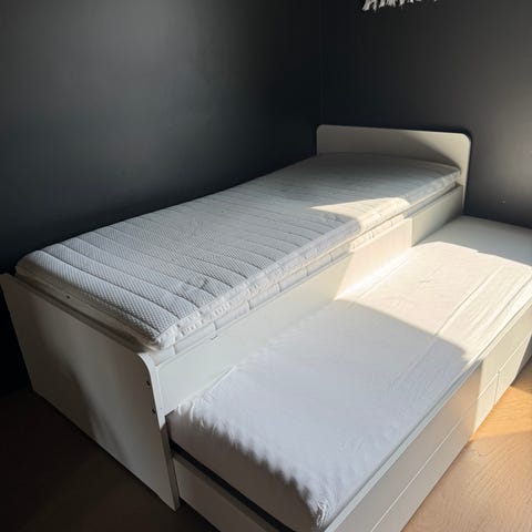 IKEA seng med uttrekksseng i hvit utførelse. Hovedsengen har en enkel liggeflate, og under finnes en uttrekksseng på hjul som kan trekkes ut ved behov. Rammen er i hvit materialfinish og er egnet for standard enkel madrassstørrelse. Passer for ett eller to soveplasser avhengig av om uttrekkssengen er i bruk. Egnet til soverom, barnerom eller gjesterom der det er behov for ekstra sengeplass på begrenset areal.