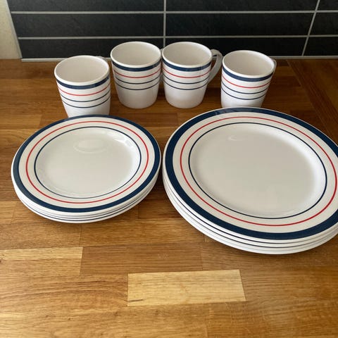 Diverse servise i melanin og plast selges samlet for 200,-.