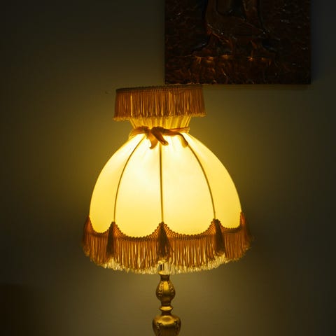 Superkul lampe med herleg lampeskjerm med frynsar. Skjermen har noko som kan likne vannskade, men dette er ikkje for godt synleg, spesielt ikkje når lampa er i bruk