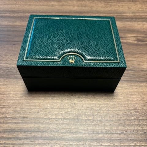 Mellomblå boks med preget Rolex logoer på utvendig skinn. Lys blå semsket skinninnredning og to innvendige, avtakbare skuffer (ett for halskjede) og rom for ringer, halskjeder, armbånd, øredobber og klokker; inkluderer en gulllås med preg "Rolex" og en gullnøkkel.