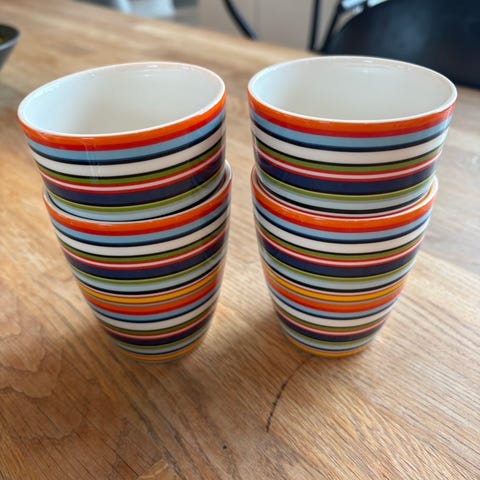 6 stykk Iittala Origo krus i oransje stripemønster. Krusene er nesten ikke brukt.