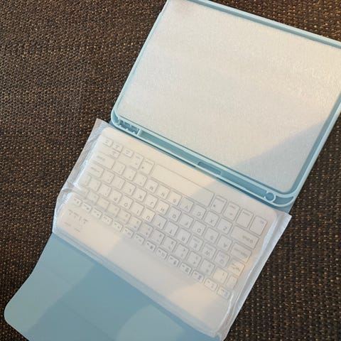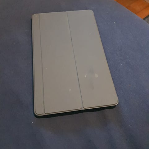 Bildene viser et iPad Air-etui med frontdeksel som kan brettes, samt en penn som kan brukes sammen med nettbrettet.