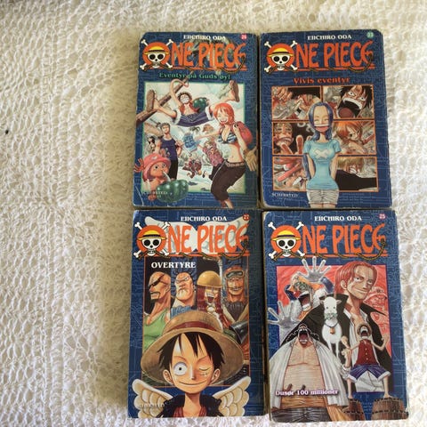 Eiichiro Oda One Piece manga bøker på norsk, vol. 4, 5 og 7. Serien er utgitt som pocketbøker med svart-hvitt-tegninger i vanlig mangaformat. Inneholder volumene «Nymåne», «Klokkene ringer for deg» og «Drittgubben». Egner seg for lesere som følger One Piece-historien i norsk oversettelse og ønsker disse numrene samlet.