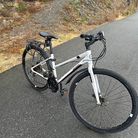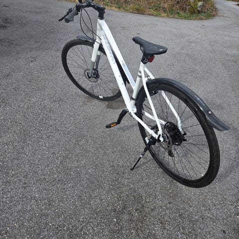 Sykkelen er uten feil og mangler. 18" aluminiums ramme og 21 gear. Shimano gearsystem. Champagne farget. Lykt - fremme og bak, kurv og "bukkehorn" følger. Fin og god sykkel!