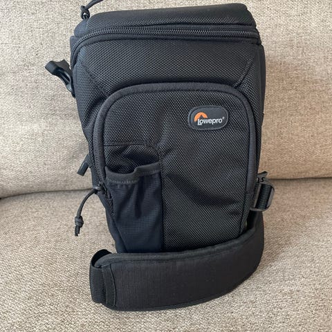 Lowepro kameraveske i svart. Vesken er utformet for speilrefleks- eller systemkamera med ekstra objektiver og tilbehør. Hovedrommet har polstrede og justerbare skillevegger for å beskytte utstyr, samt lokk med glidelås. På sidene er det ekstra lommer for oppbevaring av mindre tilbehør. Vesken har justerbare stropper og beltefeste for bæring rundt livet eller over skulderen. Egnet for organisert og beskyttet transport av kamerautstyr.