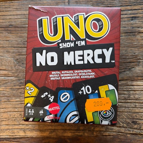UNO Show ’Em No Mercy kortspill. Variant av det klassiske UNO-spillet med ekstra spesialkort og regler som gir flere handlinger per runde. Spilles med kortstokk på 168 kort. Egnet for flere spillere og passer til både familie og vennegjenger. Språk og aldersanbefaling fremgår av esken. Har 5 pakker- hver pakke koster 120kr.
