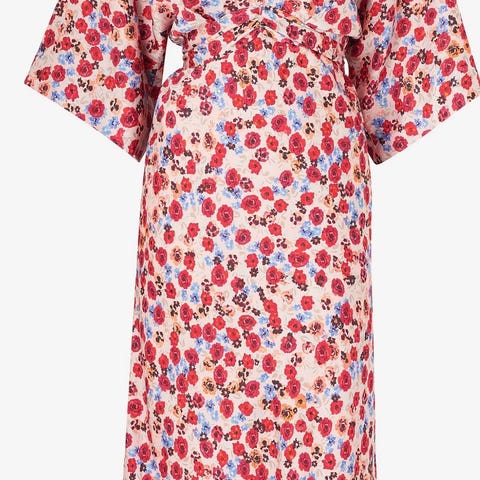 Gammelrosa i bunn med fint blomstermønster i flere farger.