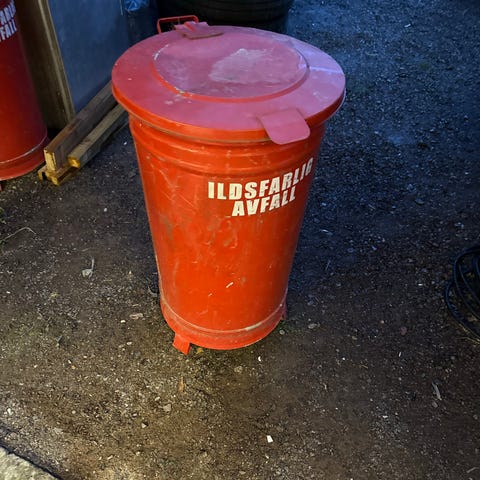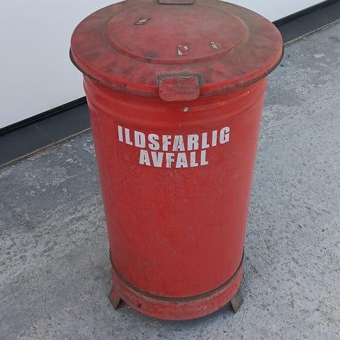 Rød metallbeholder for ildsfarlig avfall med lokk. Beholderen er sylinderformet og laget i metall, med påskrift «ILDSFARLIG AVFALL» på siden. Den har fastmontert lokk med håndtak og står på små føtter som løfter den fra underlaget.