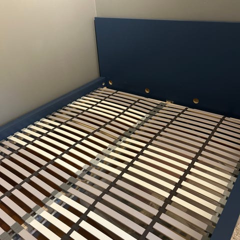 IKEA seng med hodegavl i hvit utførelse. Rammekonstruksjon i tre/plate med rett hodegavl med tre åpninger. Passer som dobbeltseng, egnet for standard madrassstørrelser for to personer. Nøytral farge som gjør at sengen kan brukes i ulike soveromsmiljøer.