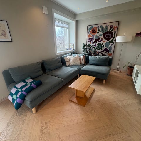 IKEA sin SÖDERHAMN 3-seters modul grunnet flytting. Den er svært komfortabel og har et tidløst design som passer godt inn i de fleste hjem. Trekket kan renses for å forbedre utseendet, eller eventuelt byttes dersom man ønsker et helt nytt trekk. Noen merker bak på sofaen.