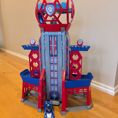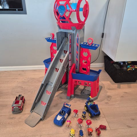 Paw Patrol lekesett tårn med sklie i plast. Lekesettet består av et høyt tårn med rampe og sklie hvor kjøretøy kan sendes ned. Det har flere plattformer og nivåer rundt tårnet, samt detaljer i rødt, blått og grått. Egnet som rollelek for barn som liker Paw Patrol-universet og kjøretøylek. Kan kombineres med andre Paw Patrol-figurer og -biler
