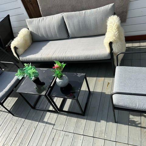 Dette er et førsteklasses tilskudd til enhver hage, terrasse eller uteplass. Enten for lange middager med familie eller venner, for en flott kveldskaffepause eller for å nyte vakker sommersol. Settet er solid og slitesterkt.