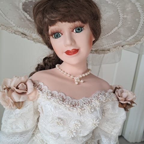 Vintage, tidlig 70- tallet. Av plast og stoff. Med praktiske lommer. Barndomsminne? Hun er 78 cm lang og ca 38 cm bred. Kan settes på kjøleskap med evnt magneter, eller en dekorativ sjarm på veggen. Lommer skjørt.